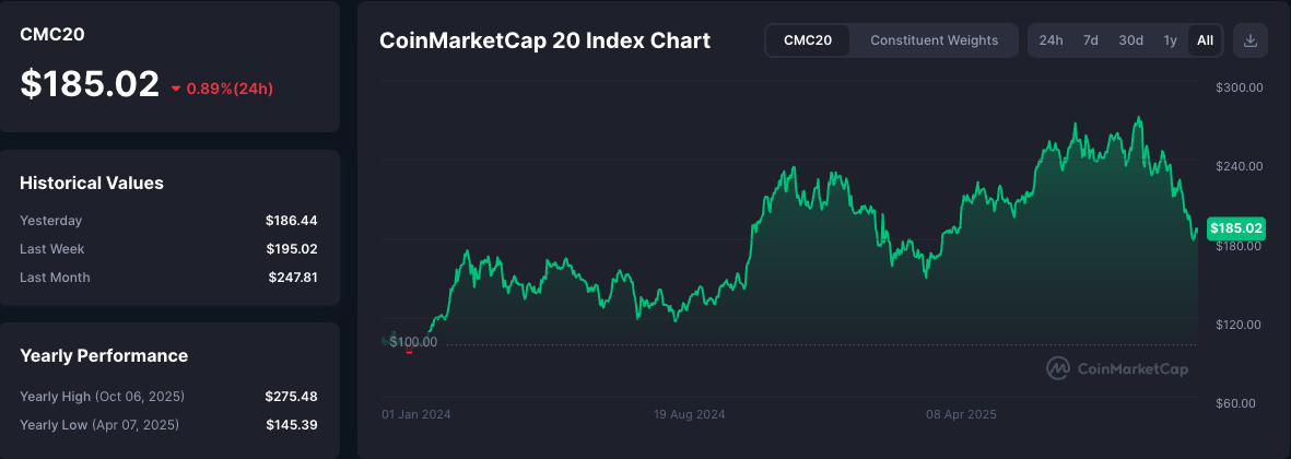 CMC20 is a crypto index that shows the price performance of the top 20 biggest cryptocurrencies in the market. It helps people understand the general trend of the crypto market in a simple and clear way.